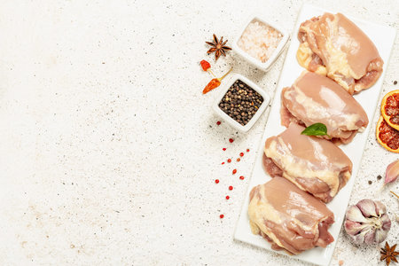 Raw chicken thigh without bones or skin. A useful ingredient for preparing healthy food, spices, garlic. Light putty background, top view