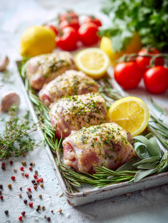 Juicy chicken thighs marinated with fragrant herbs and zesty lemon, nestled among colorful spices and plump cherry tomatoes on a vintage metal tray, ready to be cooked.
