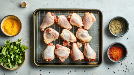 Raw chicken wings placed on a wire rack over a baking tray, with seasonings arranged in small bowls nearby.