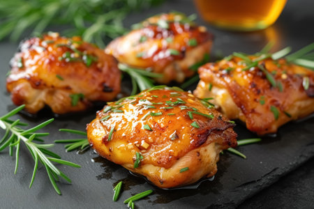 Chicken thighs in mustard honey glaze on black plate decorated rosemary on concrete background.
