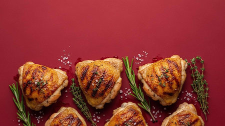 Chicken thighs fried with salt, spices and herbs on a dark concrete background
