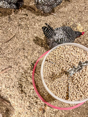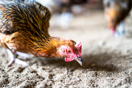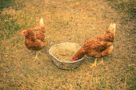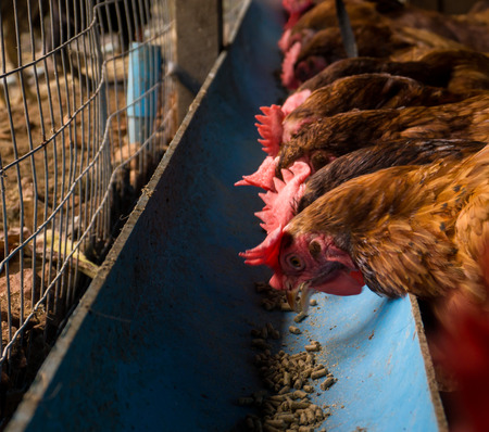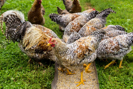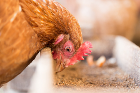 Chicken eats feed and grain at eco chicken farm, free range chicken farm.