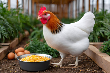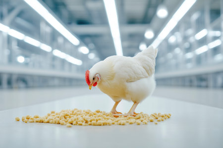 Chicken Pecking at Food in a Clean, Well-Lit Indoor Pen