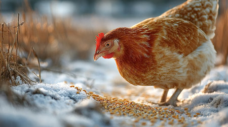 Free range chicken pecking at scattered wheat grains on a snowy landscape, enjoying a natural and healthy diet while surrounded by the serene beauty of winter