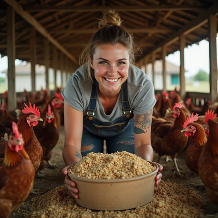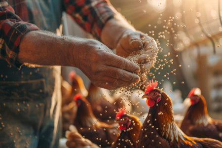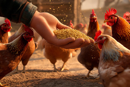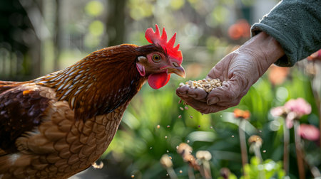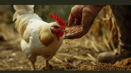 Farmer hand-feeding free-range chickens with organic grain on a rural farm,