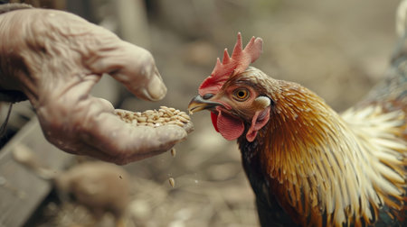 Farmer hand feeding rooster with grains. Rooster is a breed of chicken.