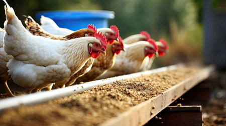 free range organic Hens chickens pecking eating grain feed tray in country farm