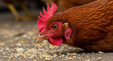 Detailed view of a chicken beak mid-peck, eating grains on the ground, showcasing farm life and poultry feeding behavior.