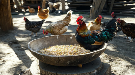 Barnyard Feast, Colorful Chickens Gather Around a Rustic Wooden Bowl Filled with Grains.