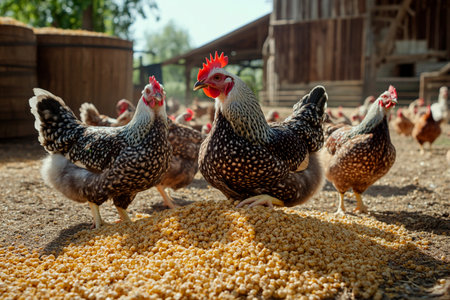 A lively group of speckled chickens gather around a mound of corn, enjoying their meal in a sunlit farmyard. The surrounding rustic barn adds charm to this serene countryside setting.