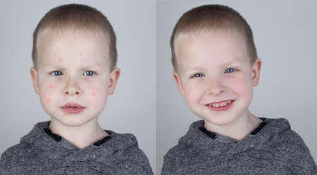 Before and after. The child shows a face with a lot of red allergic acne. The second picture shows a clean face without any allergies. The concept of the treatment of children's rashes. Chickenpox