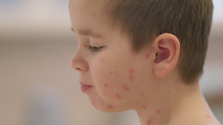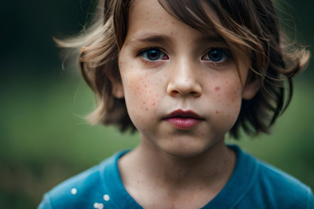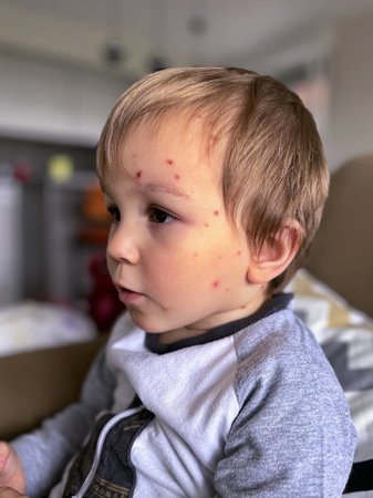 A child with a skin condition chickenpox is shown indoors, expressing emotions, care, and health awareness