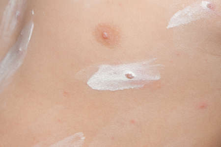 Treatment of ulcers from chickenpox, chickenpox with a healing cream on the skin of a child. Close-up of a child's back treated with red medicine.