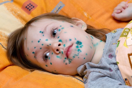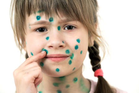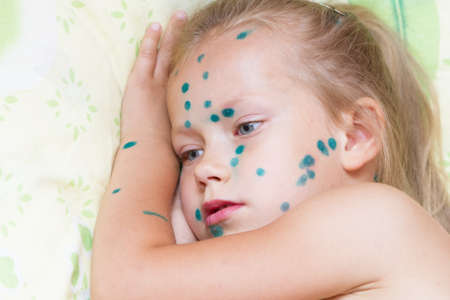 Child girl covered with green rashes on face ill with chickenpox, measles or rubella virus.
