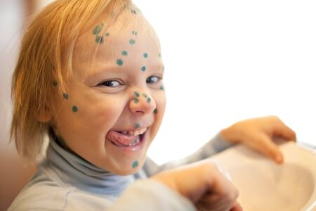 Cute little toddler boy covered with measles blisters and rash treated with ointment for itching and scratching prevention