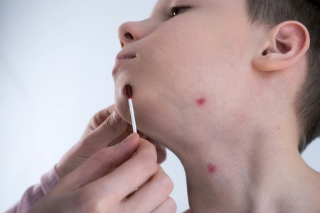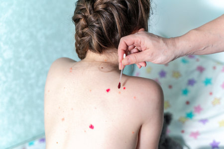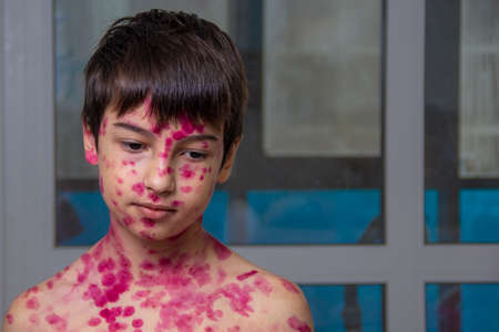 Mom lubricates the rash from chickenpox on sons body and face with with red antiseptic using cotton buds.11-year-old boy suffers from chickenpox. Varicella blisters lubricated with antiseptic drug,