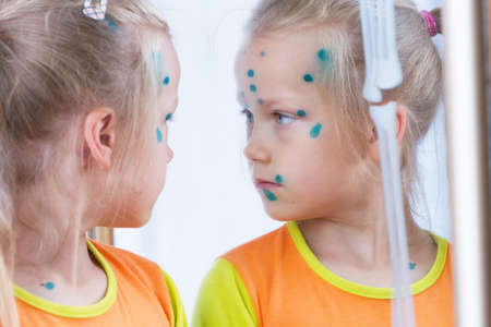 A child girl with chickenpox looks in the mirror. Portrait of a child in the mirror