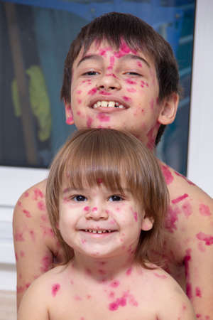 Children covered with green rashes on stomach ill with chickenpox, measles or rubella virus.