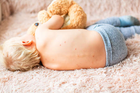 The back of a 5-year-old child covered by varicella (chickenpox), showing spots on the skin,