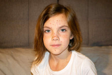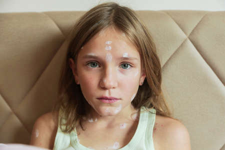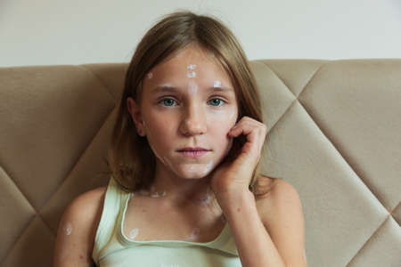 Child portrait with chickenpox. Sick little girl with varicells making eruption on skin. Long home quarantine, then having immunity for ever.
