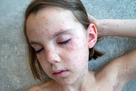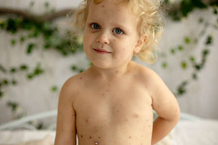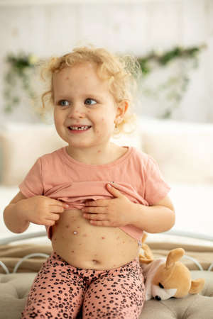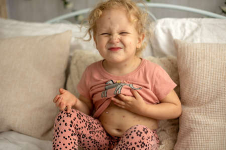 Toddler girl with chickenpox measles on the body. Varicella virus childhood contagious disease. Itchy red blisters, fever, pain symptoms.