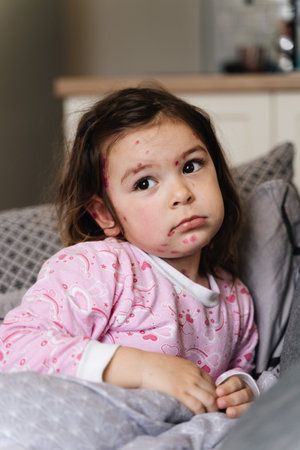 Cute little girl with chickenpox at home. Varicella zoster virus.