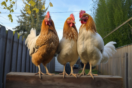 chickens perched on a wooden fence in the backyard, created with generative ai