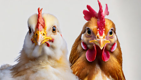 Two chickens on a white background, close-up, studio shot