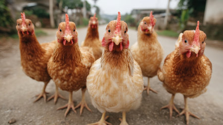 A captivating scene featuring a group of curious chickens standing on a dirt road in a rural setting, showcasing their vibrant feathers and playful nature.