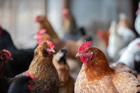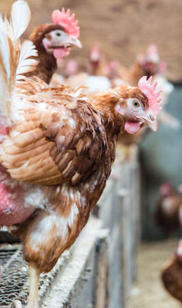 free roaming brown chicken on organic farm in poultry barn in sunshine with white rooster in the middle