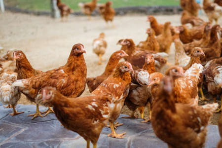 chickens at a chicken farm outdoors. Chicken farm concept.Chicken in the backyard near the chicken coop