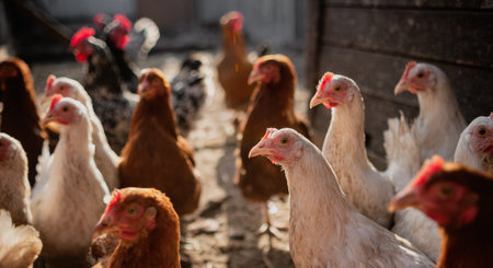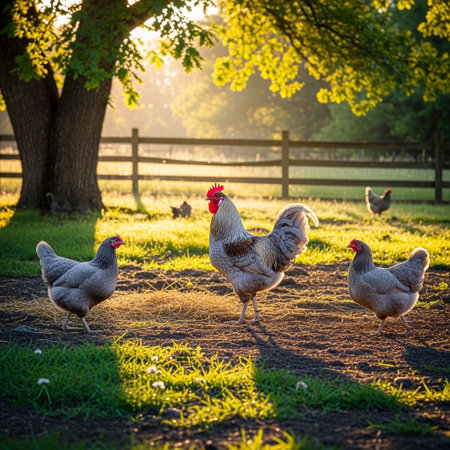 Chickens roam freely in a farmyard, pecking at the ground and interacting with each other under the warm sun. The setting creates a lively and natural atmosphere in the countryside