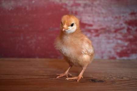 A chick on wood with a red barn board background