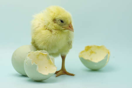 Newborn yellow chicken. Chick hatched from an egg. Chicks together with eggs background for the poultry farm.