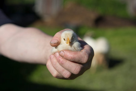 close up shot of a strong, rough hand with dirty nails of a man farmer holding a small cute newborn baby chicken chick