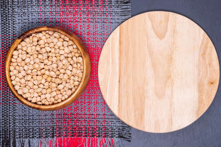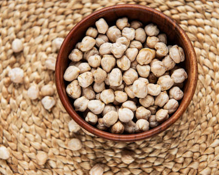 Chickpeas in a wooden bowl on kitchen table. Raw chickpeas. flat lay copyspace