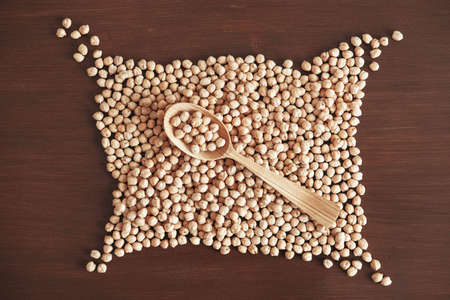 Dry chickpeas in a wooden plate and spoon on a brown wooden background. Top view. Copy, empty space for text.