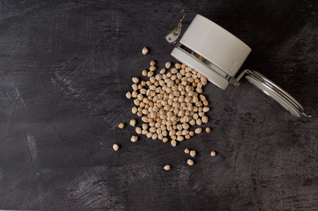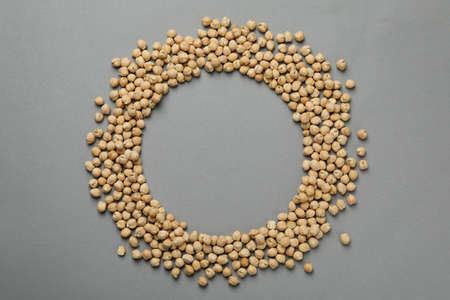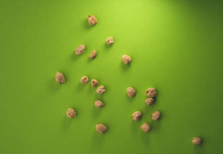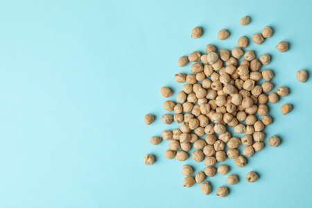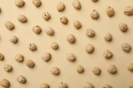 Legumes are scattered in the background, natural background of chickpeas, top view