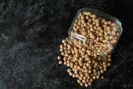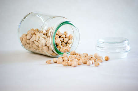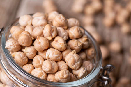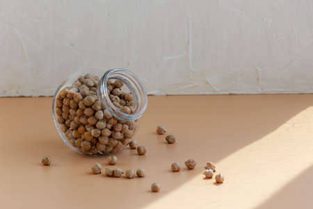 Close-up of dry chickpeas in a glass jar, Vegan cooking concept, Natural organic food.