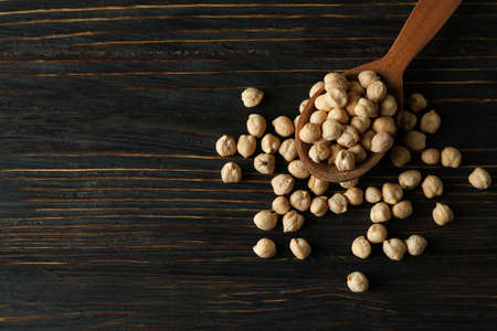 Raw chickpeas in a wooden spoon scattered on a wooden background. Top view. Copy, empty space for text.