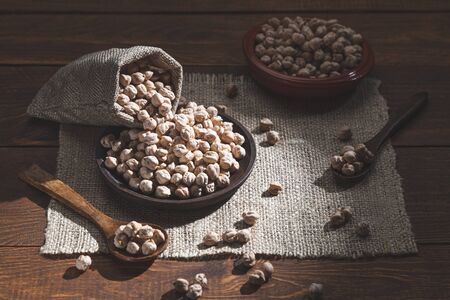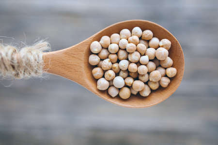 Uncooked dried legume chickpeas or garbanzo bean in wooden rustic spoon on blurred background. Vegetarian super food. Healthy eating and dietary. Indian, Mediterranean cuisine. Soft focus