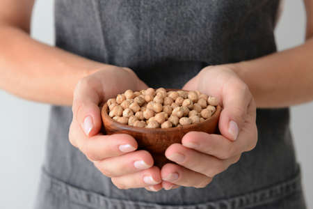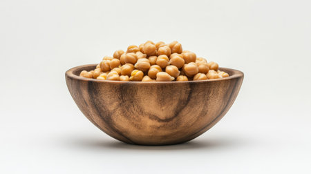 Wooden bowl filled with chickpeas on white background, healthy food concept