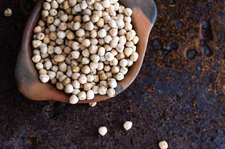 uncooked organic chickpeas in a barrel on a wooden table. vegetarian food. top view