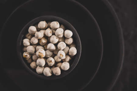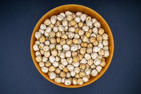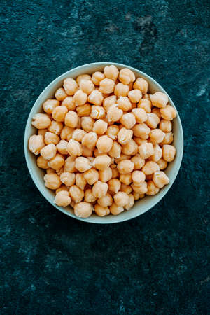 high angle view of some cooked chickpeas in a ceramic bowl placed on a dark stone surface