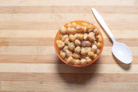 Cooked chick peas in a beautiful authentic plate. Spilled chick peas. Top view