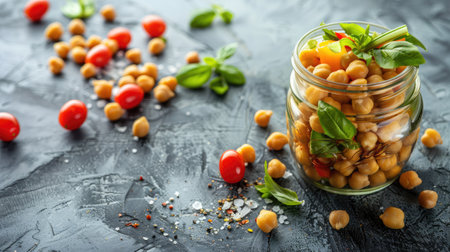 Mason jar salad with chickpeas, lettuce and vegetables on gray background with copy space for text