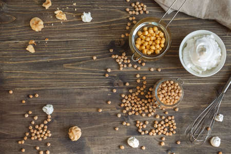 dry chickpea seeds, aquafaba broth and and whipped soft meringue in a bowl on a dark wooden table. Top view with space