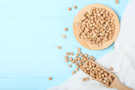 A portion of dried chickpeas in a wooden spoon on a blue table with green leaves. Concept of proper balanced nutrition and healthy vegetarian food.