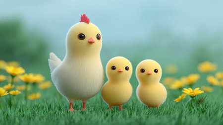 This vibrant illustration showcases a cute cartoon chicken accompanied by two fluffy chicks in a blooming meadow, radiating charm and joy.