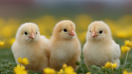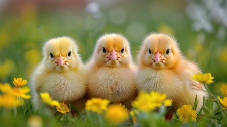 Three fluffy yellow chicks stand together in a field adorned with vibrant yellow flowers, creating a delightful and cheerful spring scene.
